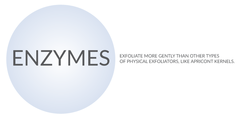Enzymes exfoliate more gently than other types of physical exfoliators, like apricot kernels. One little-known fact about physical exfoliators like apricot kernels is that they are irregularly shaped, so they can get into the pores and rip or stretch them beyond their limits.