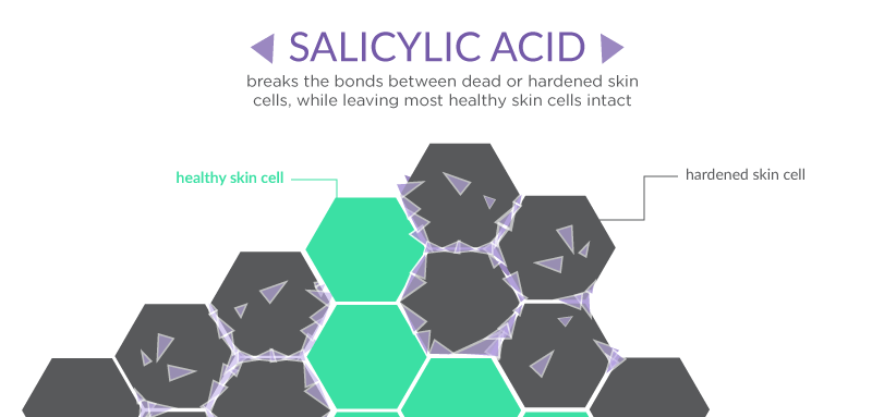 Salicylic acid is also a strong yet gentle exfoliator. One of the most potent keratolytic agents in skin care, salicylic acid exfoliates by weakening the bonds between hardened skin cells, thereby loosening cells to be exfoliated and softening the outer layers of skin (Clinics in Dermatology, SkinMed). For example, one case study found that within one week of regularly applying salicylic acid , a patient suffering from hyperkeratosis (hardening of the skin) in the heels saw a drastic improvement in terms of skin texture (less peeling), hydration, irritation and pain (SkinMed)